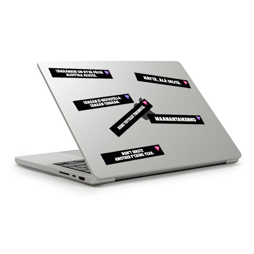 Koristele kaikki paikat motivaatiotarroilla! Tee työkaverit kateellisiksi ja tapetoi läppäri ja miksei vaikka taukohuoneen Mocca Master mietelauseilla. Ethän ole niin reppana kuin luulet. Kalliin kuuloinen hinta sisältää A4 tarra-arkin, tulevan vuoden asenteen sekä postikulut. Tuote lähetetään huomaamattomassa kirjekuoressa.